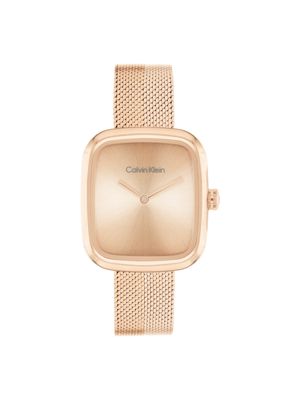 Des formes géométriques redéfinies. Cette montre CK Adore est dotée d'un boîtier sculpté en forme de réservoir, souligné d'un bracelet en maille mate et brillante.