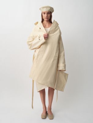 Een relaxed car coat op driekwart lengte van technisch katoen nylon faille. Valt op door de volumineuze raglanmouwen. Wordt geleverd met bijpassende Baker Boy-pet en pochet.